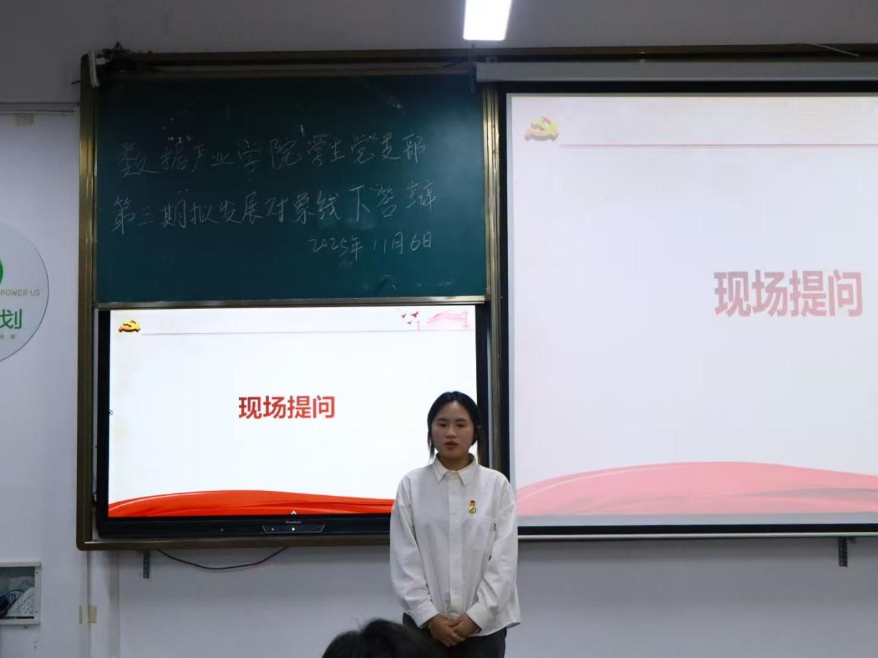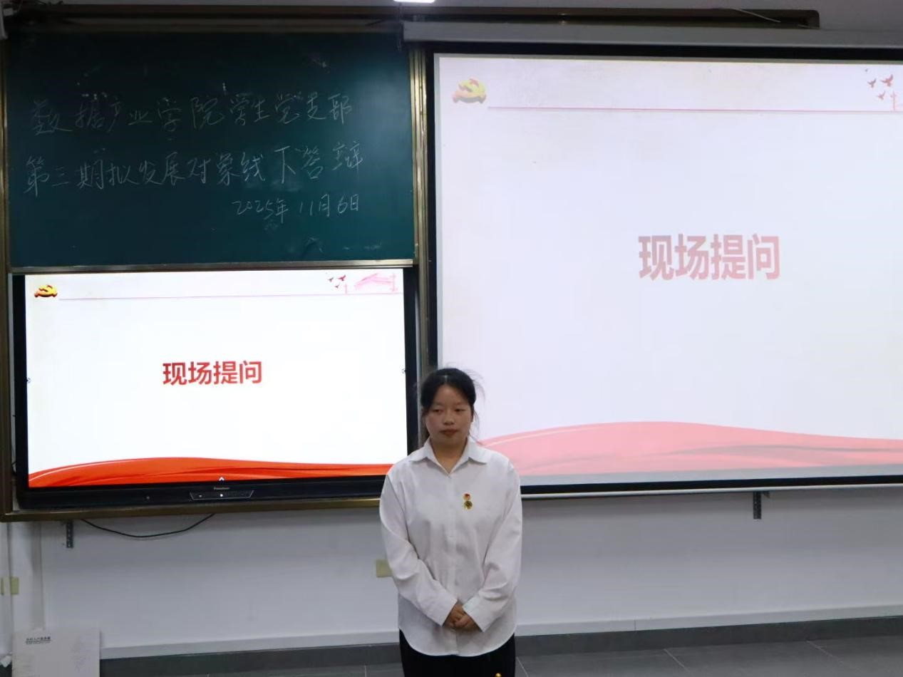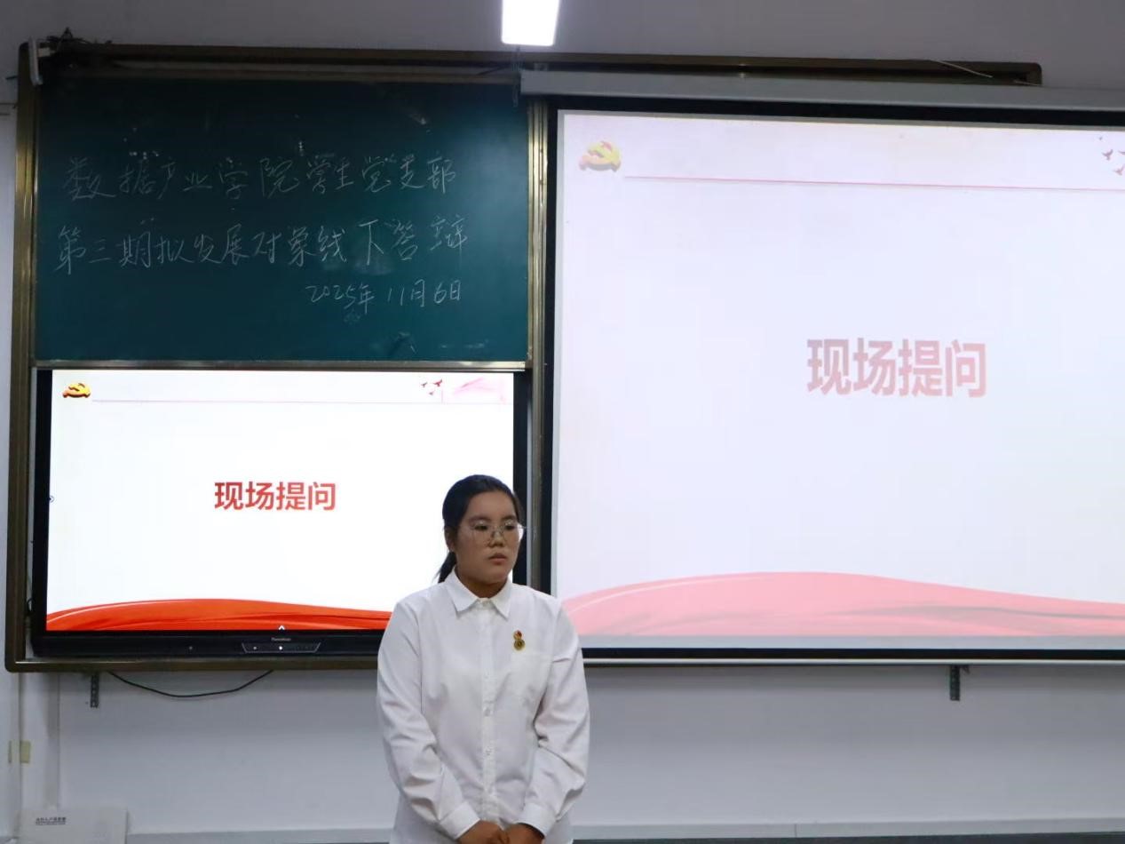 个人陈述结束后,线上提问环节随即展开。与会老师紧扣党的创新理论体系,以党的二十大精神为根本遵循,聚焦党章核心要旨、党史演进脉络、党规党纪规范及新时代党的建设总要求等关键领域、递进式的问题矩阵,采用线上随机抽题与即时作答相融合的形式,全面核验入党积极分子对党的创新理论的认知精度、政策要义的把握准度及实践应用的转化效度。推动入党积极分子在理论研习中厚植信仰根基,确保其在政治立场、政治方向、政治原则、政治道路上同党中央保持高度一致,为淬炼为合格共产党员筑牢思想理论基石。